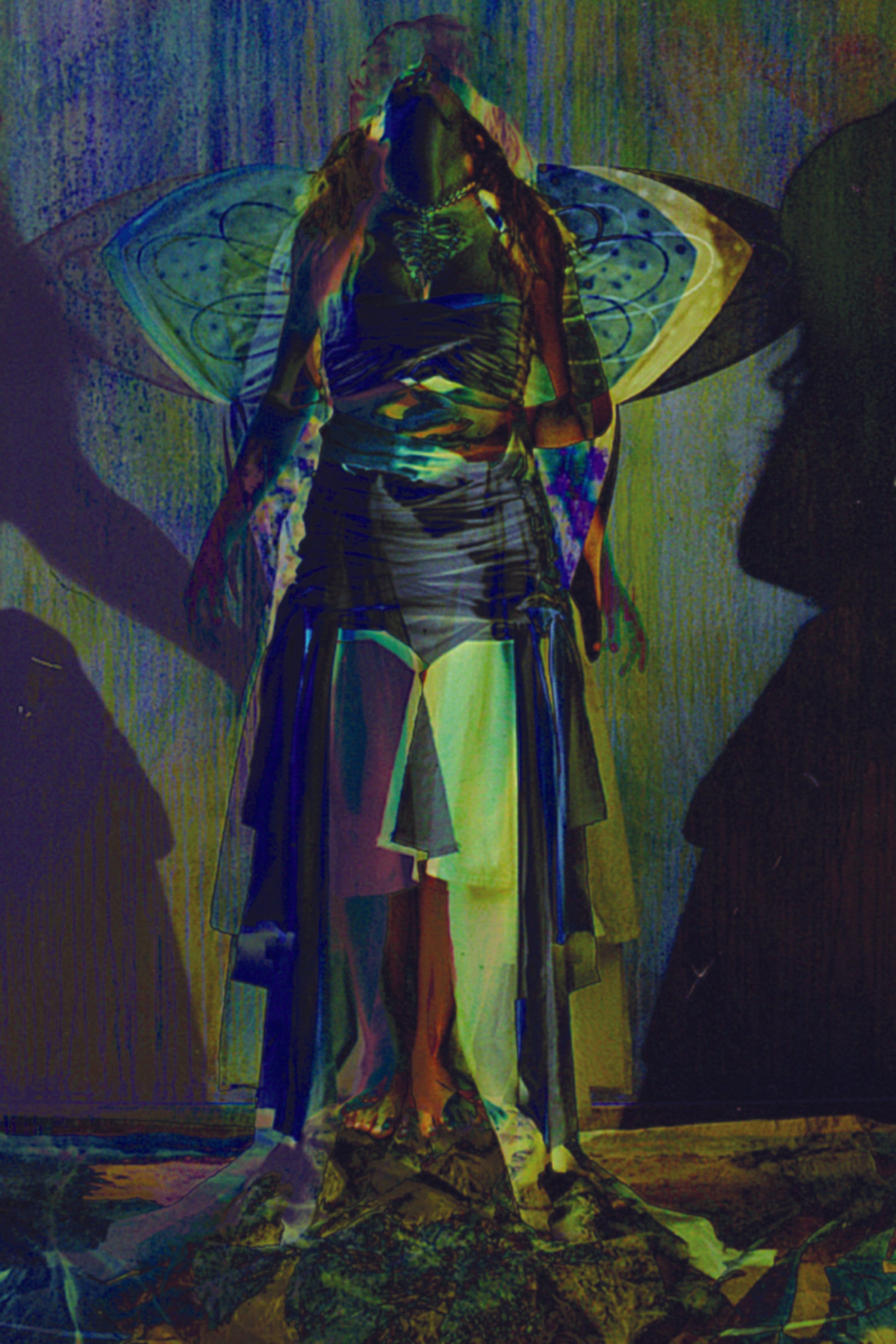 This composite photograph emerged from a collaborative session with figurative artist Charles Dwyer & local artist/fashion designer Shanel Regier. It features a layered portrayal of a female figure draped in a Grecian cloth, positioned against a backdrop of angelic wings. The image is printed on Neenah Royal Sundance Felt paper using Epson archival ink.
