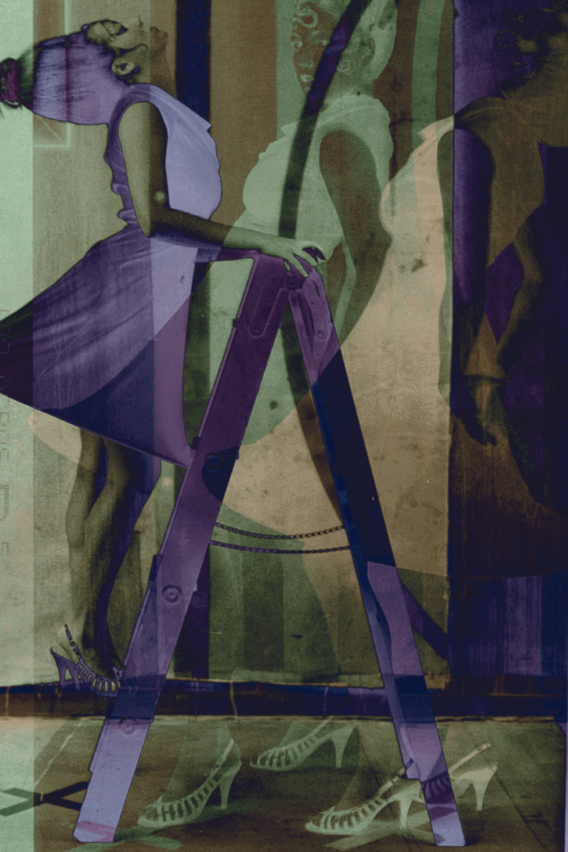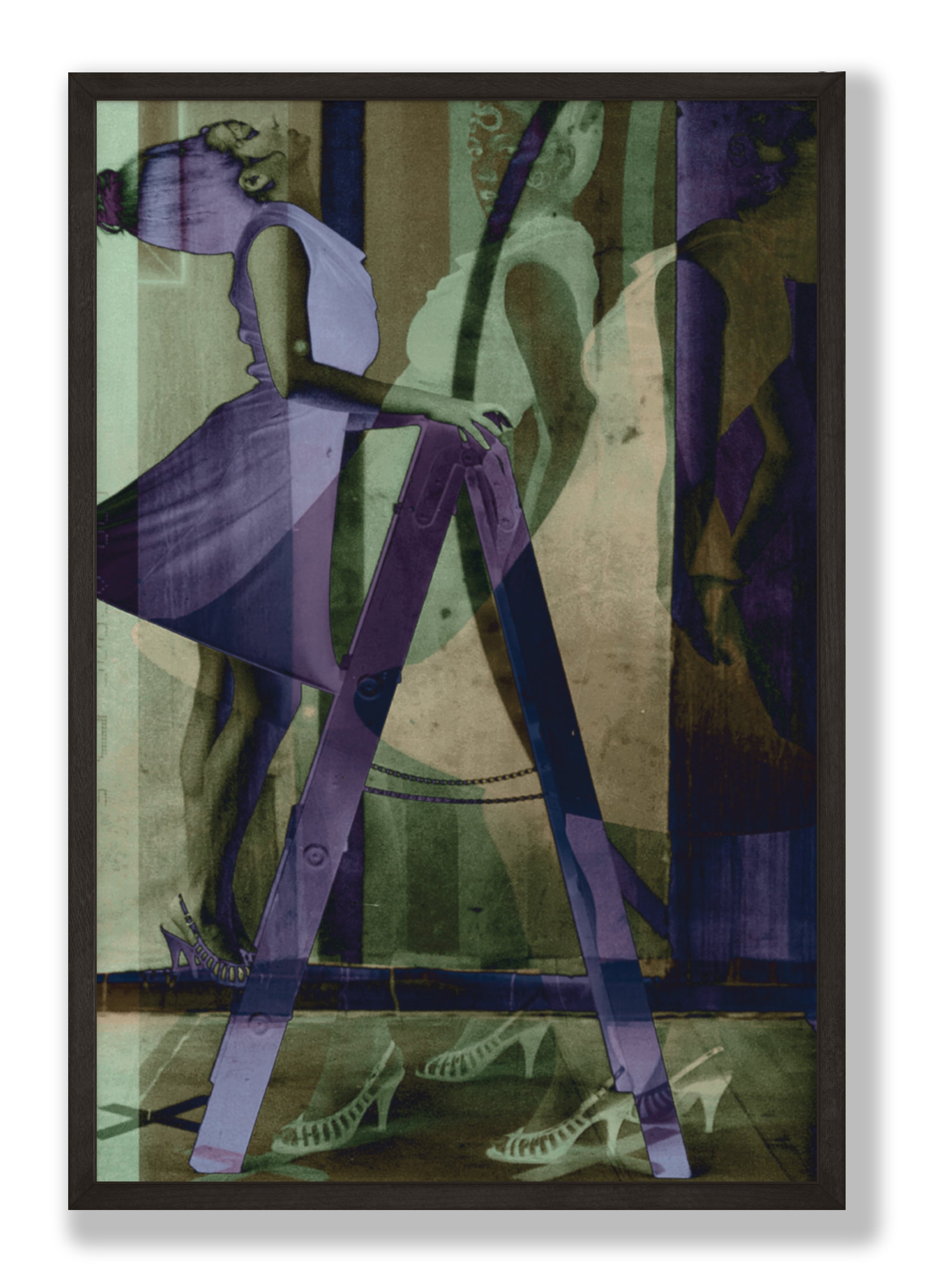 This composite photograph emerged from a collaborative session with figurative artist Charles Dwyer & local artist/fashion designer Shanel Regier. It features a layered portrayal of a female figure in a hoop skirt & a beehive hairdo, on a step ladder in front of a painted backdrop. The image is printed on Neenah Royal Sundance Felt paper using Epson archival ink.